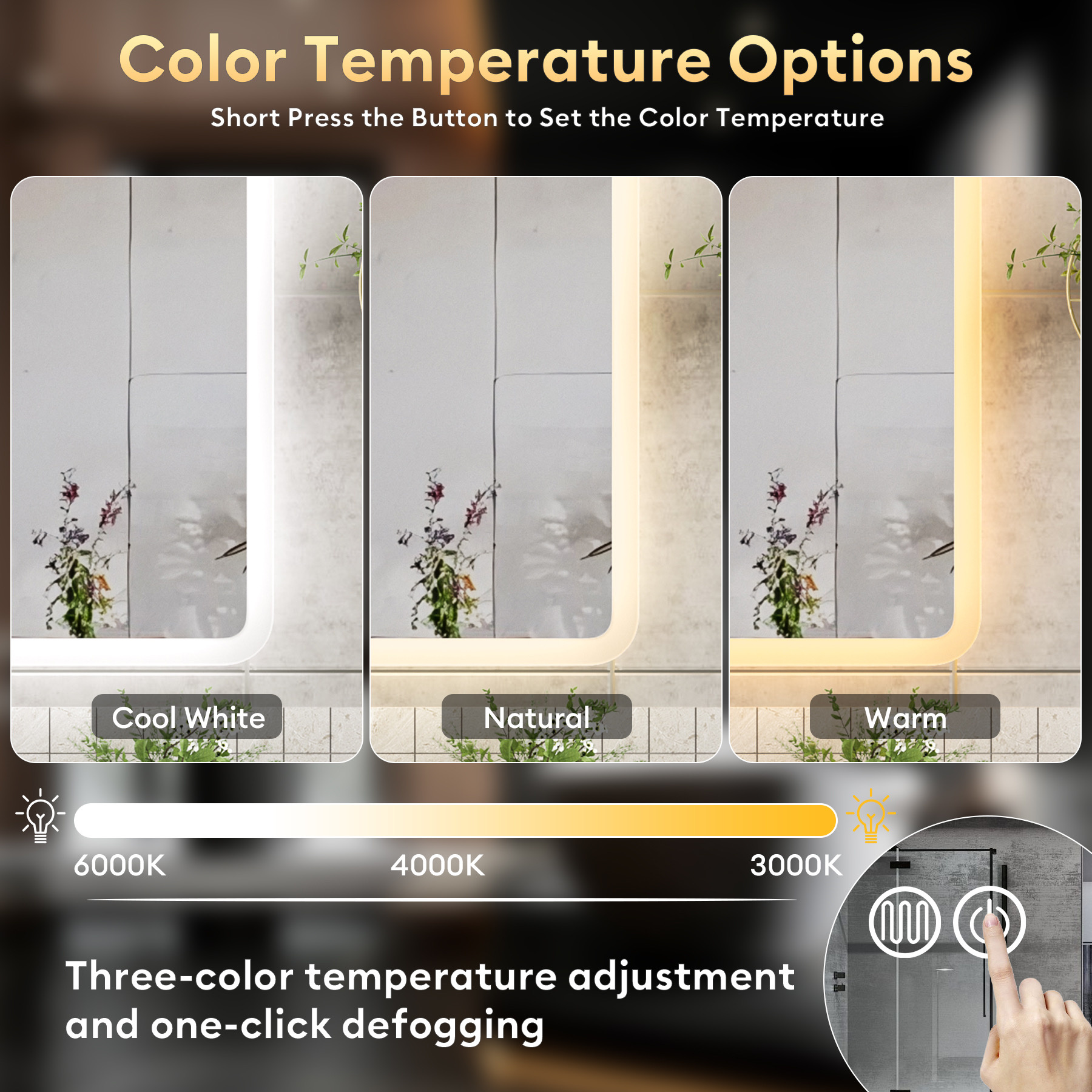 De spiegel is uitgerust met dimbare LED verlichting met 3 lichtkleuren, waardoor u eenvoudig de juiste verlichting kunt instellen voor elke situatie. Daarnaast beschikt de spiegel over anti-condens verwarming, zodat de spiegel helder blijft en niet beslaat na het douchen.