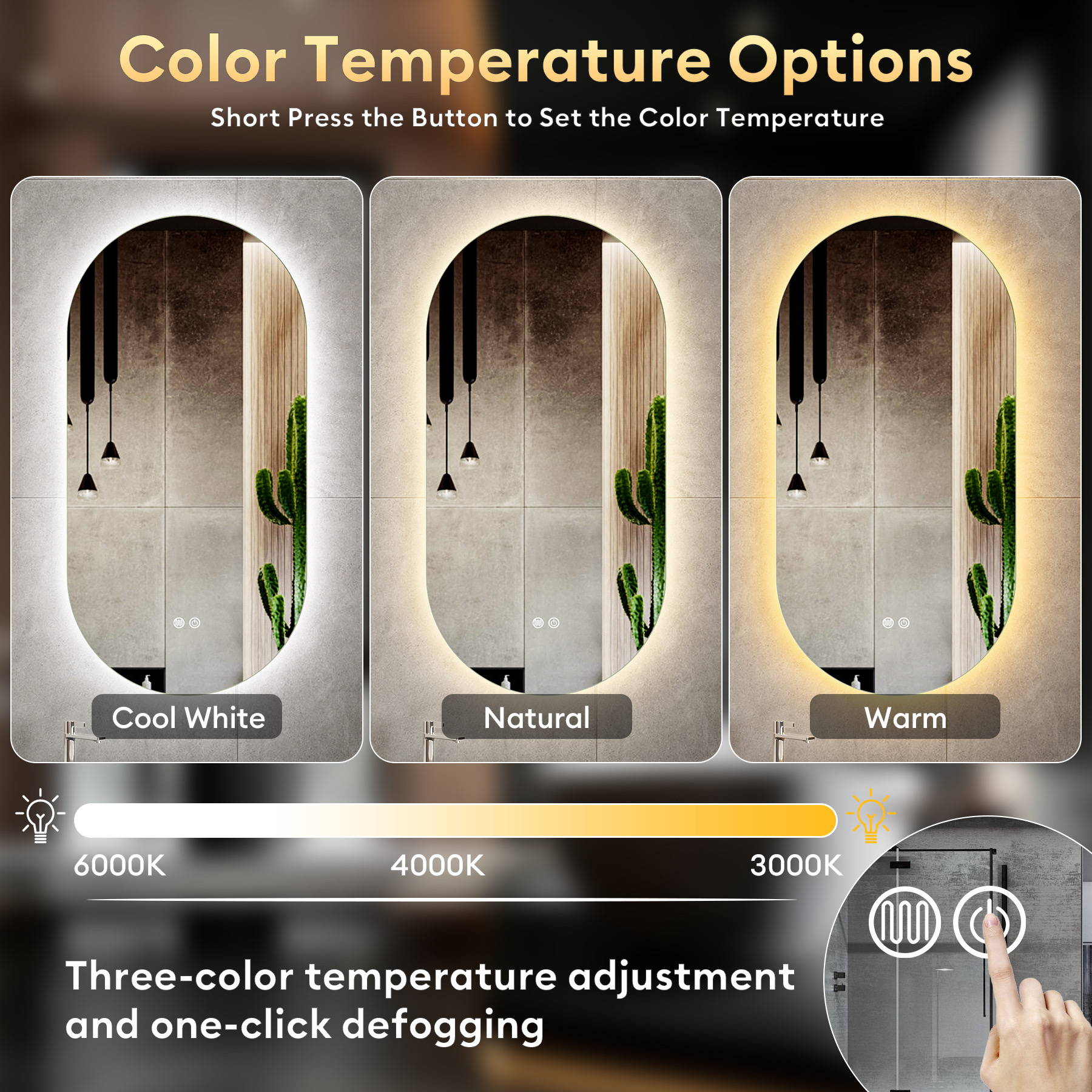 De spiegel beschikt over LED verlichting met drie verschillende lichtkleuren, zodat u altijd de juiste sfeer en verlichting kunt kiezen: