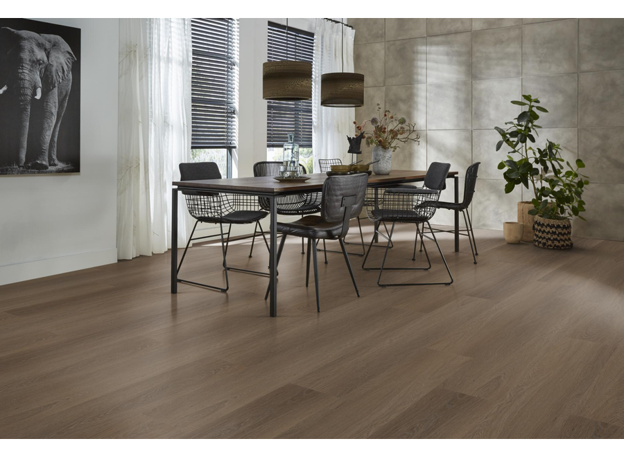 Deze vloer heeft de uitstraling van een klassieke parketvloer, maar biedt het comfort en de onderhoudsvriendelijkheid van PVC. De diepe bruine kleur en voelbare houtstructuur versterken het karakter van elk interieur. Bovendien is deze vloer dankzij de matte afwerking nauwelijks van echt hout te onderscheiden.