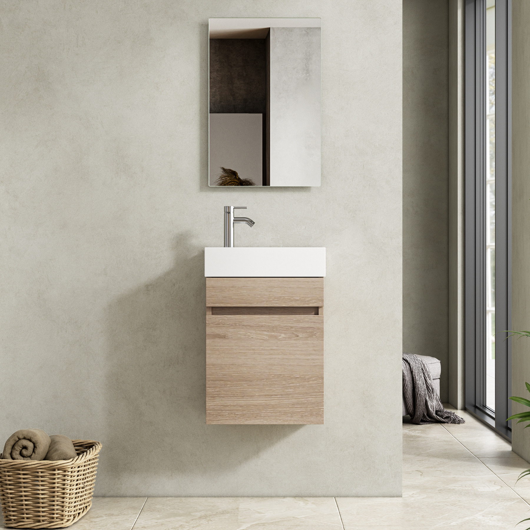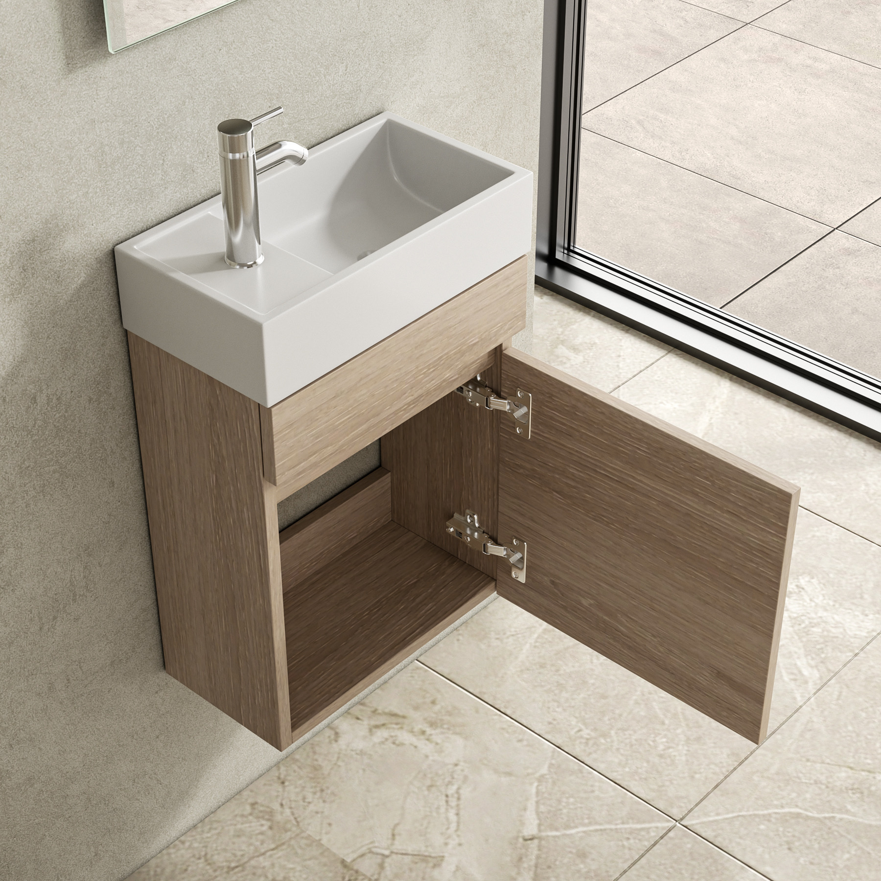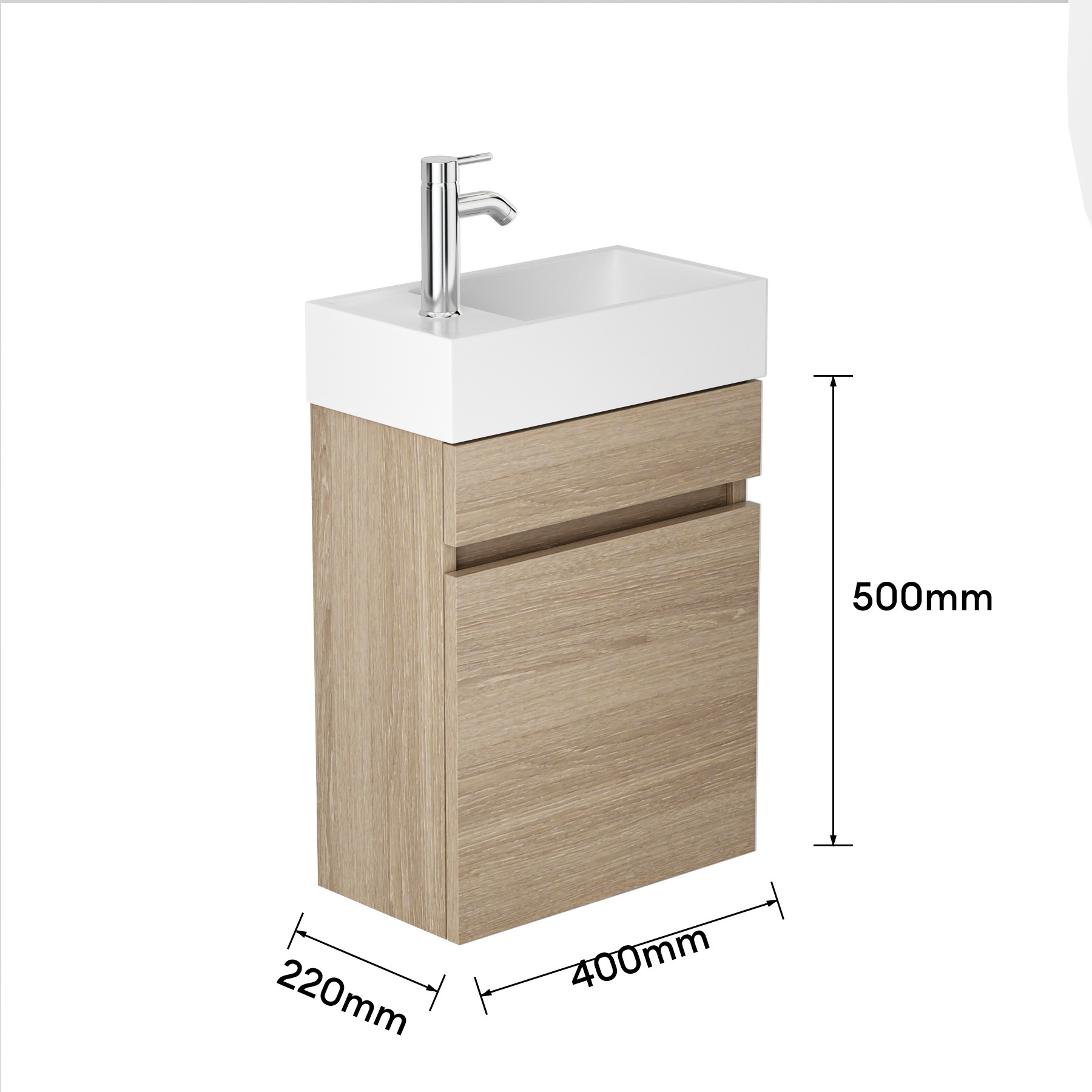 Het toiletmeubel combineert functionaliteit met elegantie en biedt voldoende ruimte voor een handwas en kleine toiletaccessoires. Het strakke design past in zowel moderne als minimalistische toiletten.